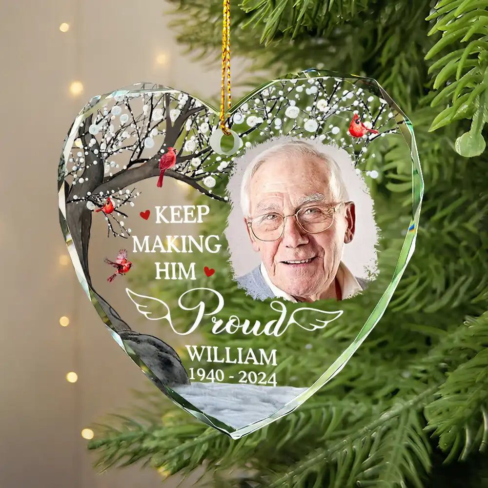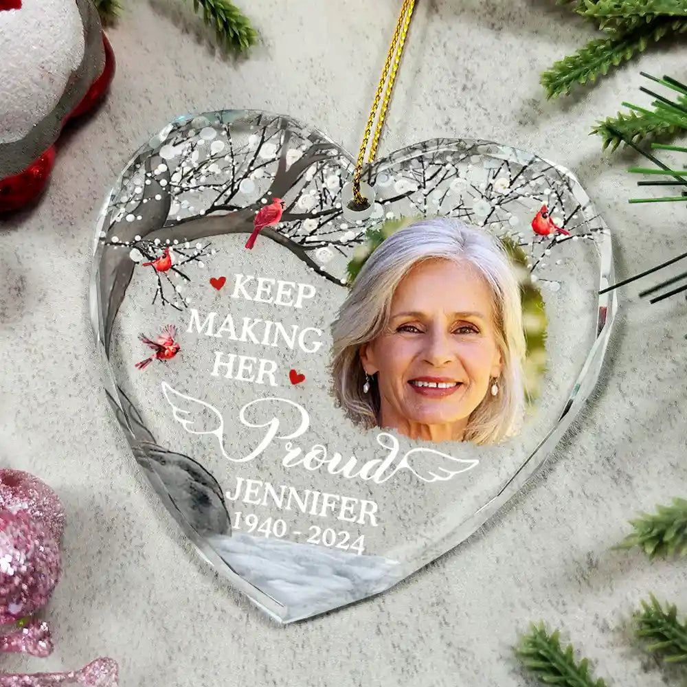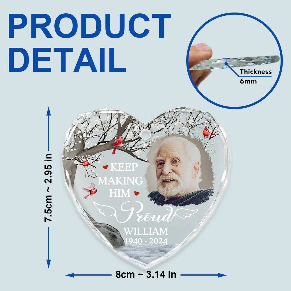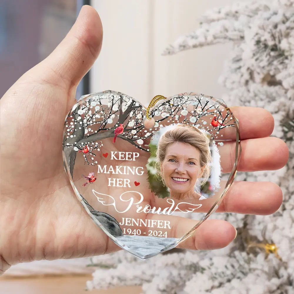 Honor cherished memories with the Custom Photo Memorial Keep Making Him Her Proud - Personalized Heart Shaped Glass Ornament. This elegant ornament is a perfect gift for Grandparents, grandpa, grandma, mom, and dad on Mother’s Day, Father’s Day, Thanksgiving, Christmas, birthdays, and anniversaries, helping to preserve the memory of a loved one in a meaningful way.